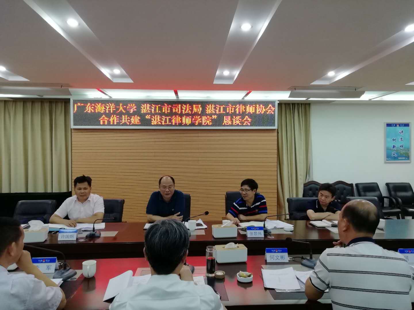 2020年6月30日上午9:30,beats365vip官网登录入口陈伟斌书记、张显伟经理、许国炯副书记、曹望华副经理等一行前往湛江司法局,与湛江市司法局、湛江市律师协会商谈合作共建“湛江律师公司”事宜。湛江市司法局颜战克局长、李军二级调研员、何文彬四级调研员,湛江市律师协会李峰会长、崔春燕副会长、钟荣副会长、黄伟燕副会长、劳逸监事长等领导员工共20多人参加洽谈会。