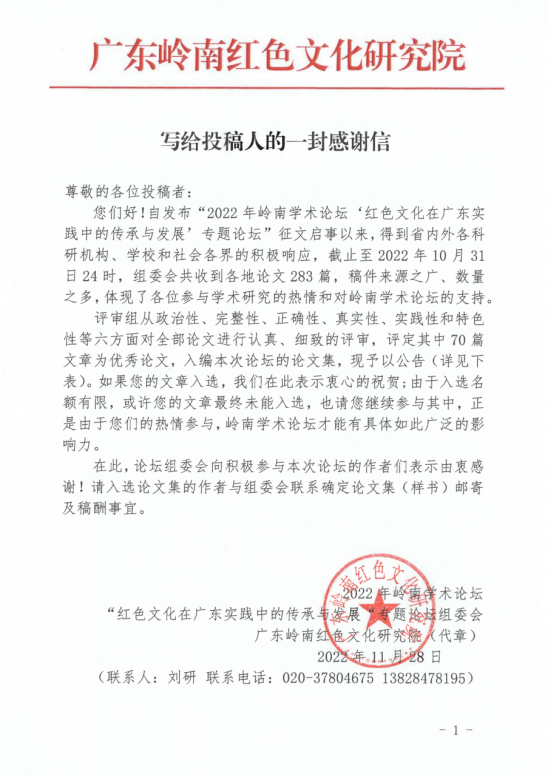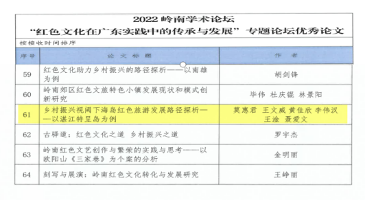 2022年11月28,beats365vip官网登录入口聂爱文教授指导社会学专业同学撰写的《乡村振兴视阈下海岛红色旅游发展路径探析—以湛江特呈岛为例》一文,参加广东省社科联2022年岭南学术论坛“红色文化在广东实践中的传承与发展”专题论坛征文比赛,获得优秀论文奖,并入编本次论坛的论文集。