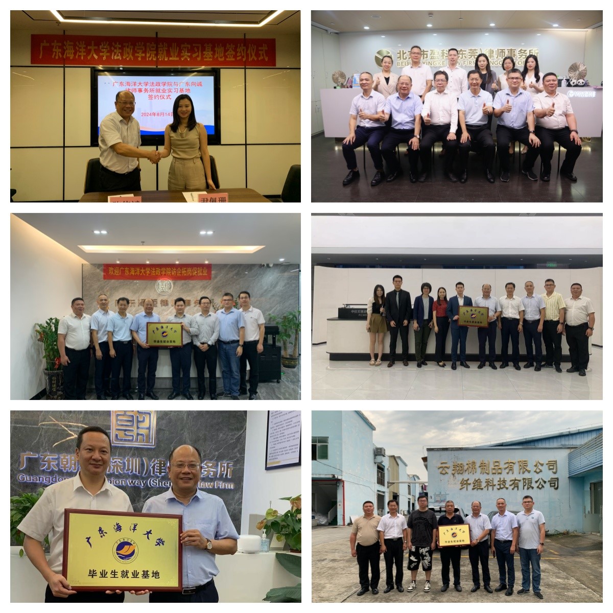 8月12-16日,法政公司党委书记林忠新、经理陈伟斌一行人等前往深圳、东莞等地走访了中伦文德胡百全(前海)联营律师事务所、广东泽钜律师事务所、广东朝胜(深圳)律师事务所、广东向诚律师事务所、北京市盈科(东莞)律师事务所、东莞市云翔棉制品有限公司,与单位负责人进行了座谈并签订协议建立毕业生就业基地。