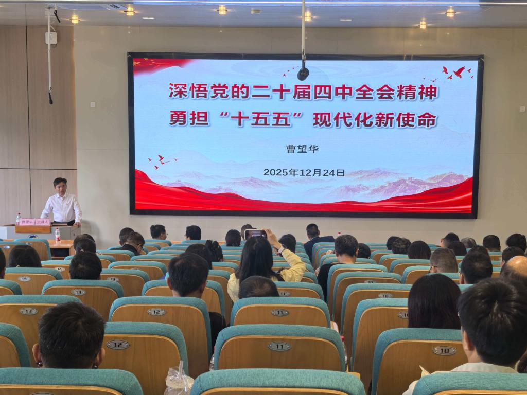 林忠新在主持讲话中指出,学习贯彻党的二十届四中全会精神是当前和今后一个时期的重要政治任务。全院教职工要以本次报告会为契机,持续深学细悟全会精神,切实把学习成果转化为干事创业的强大动力和具体行动;要立足职能,推动全会精神与团队建设、教学科研、人才培养深度融合,以高质量发展成效为公司、公司事业进步和国家战略实施贡献力量。