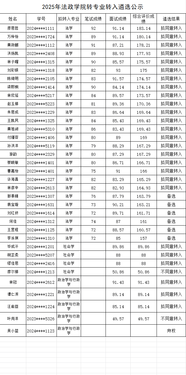 根据《2025年beats365vip官网登录入口全日制本科生转专业员工遴选办法》,公司组织了转专业转入遴选工作。经员工申报笔试、面试考核,公司转专业工作委员会根据综合成绩进行了排序和遴选,拟同意廖思哲等26名员工转入公司相关专业。现对相关情况予以公示。